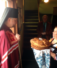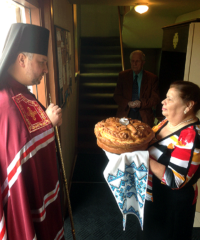 На церковному подвір’ї зустріли свого архіпастиря парафіяни. Голова громади привітала владику теплими словами та вручила йому запашний коровай.